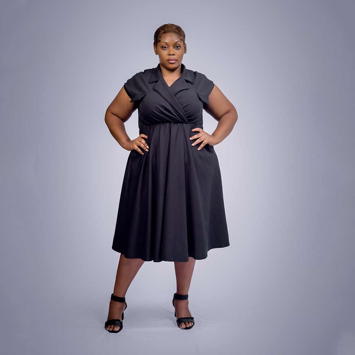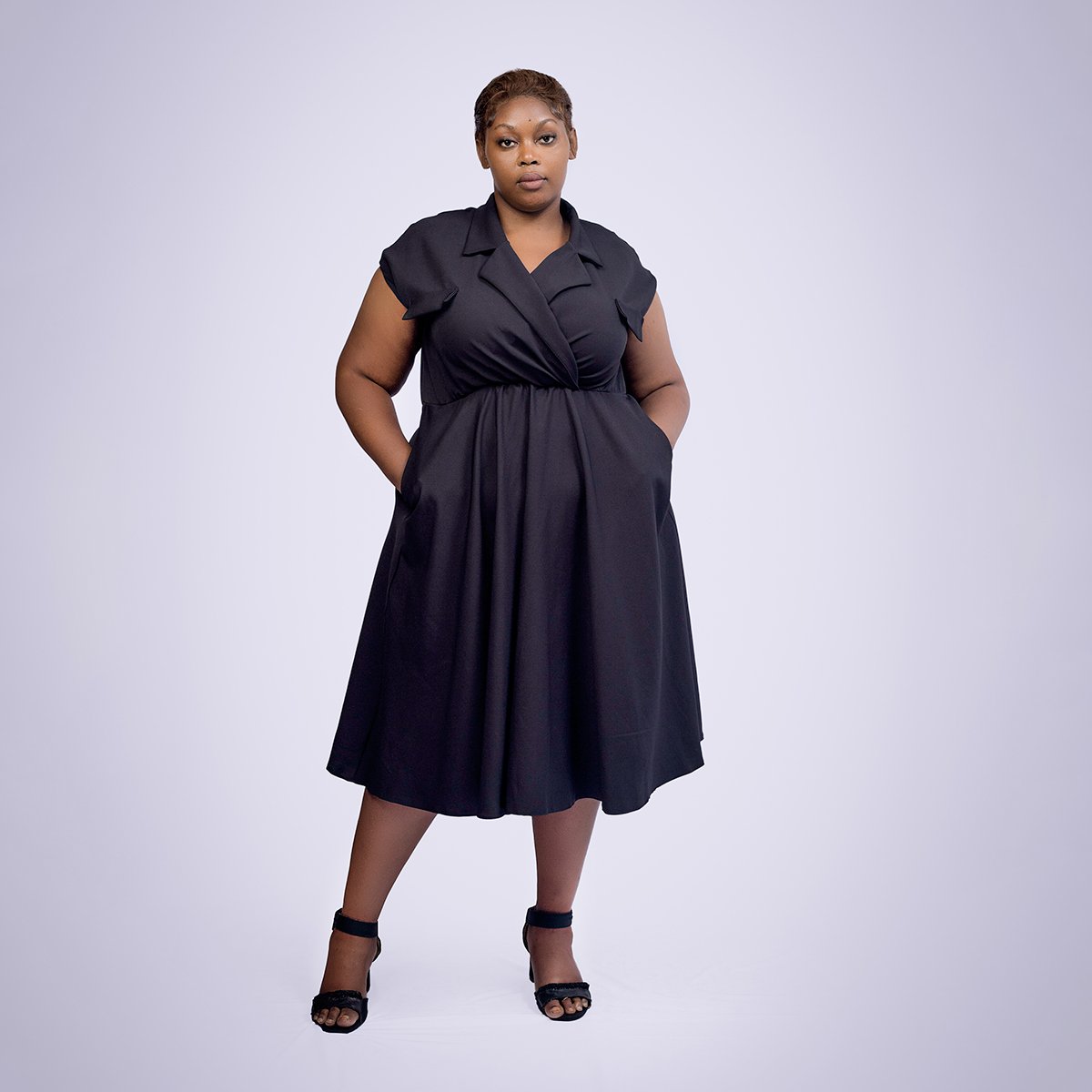 A black cargo-style dress featuring functional details and a structured silhouette, combining modern utility, timeless appeal, and refined sophistication.
