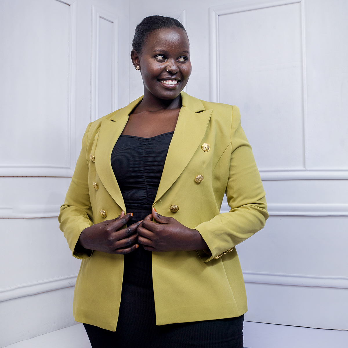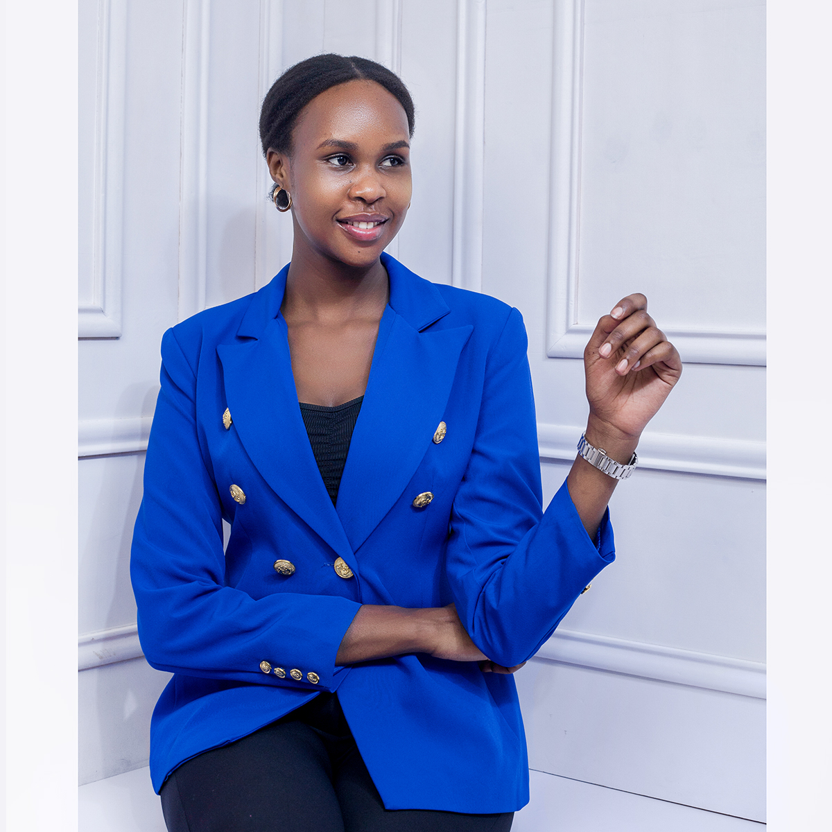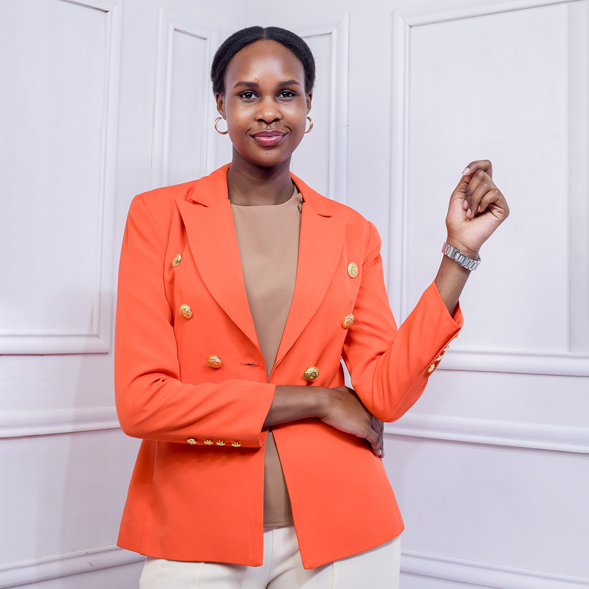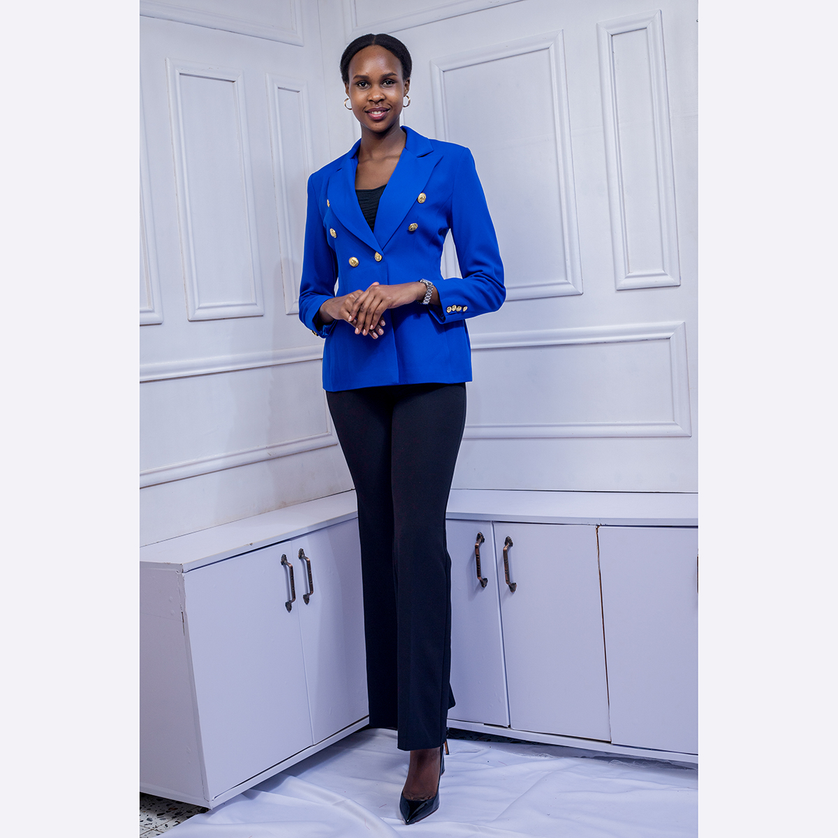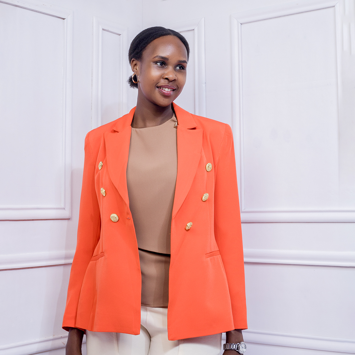 A tailored blazer accented with classic gold buttons, offering a polished silhouette, timeless elegance, and versatile styling for formal or smart-casual occasions.