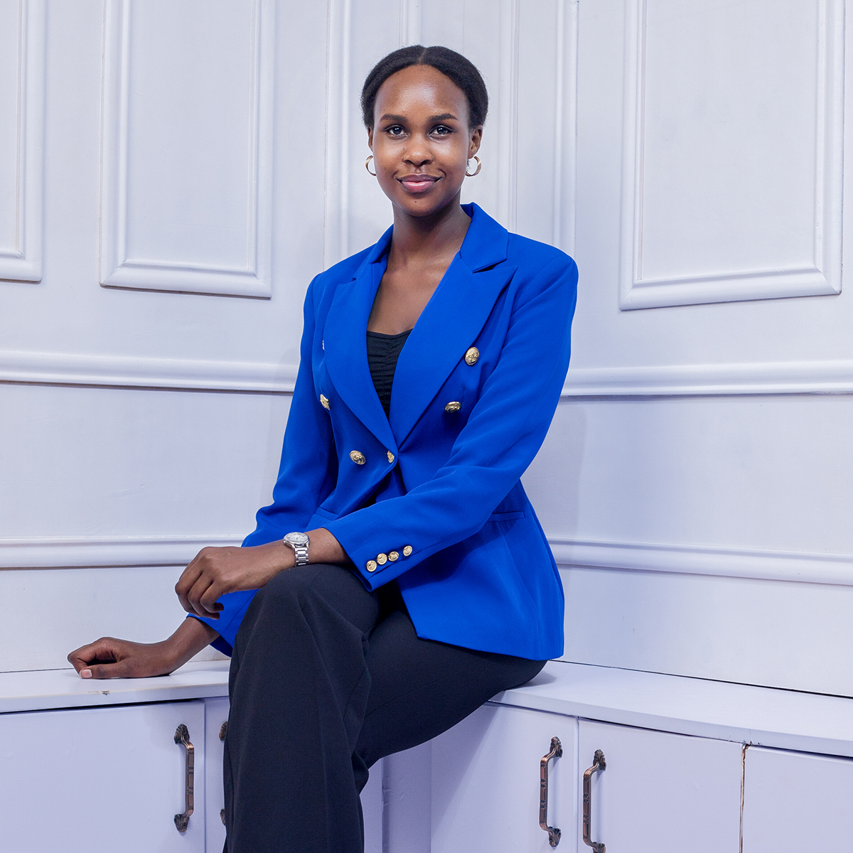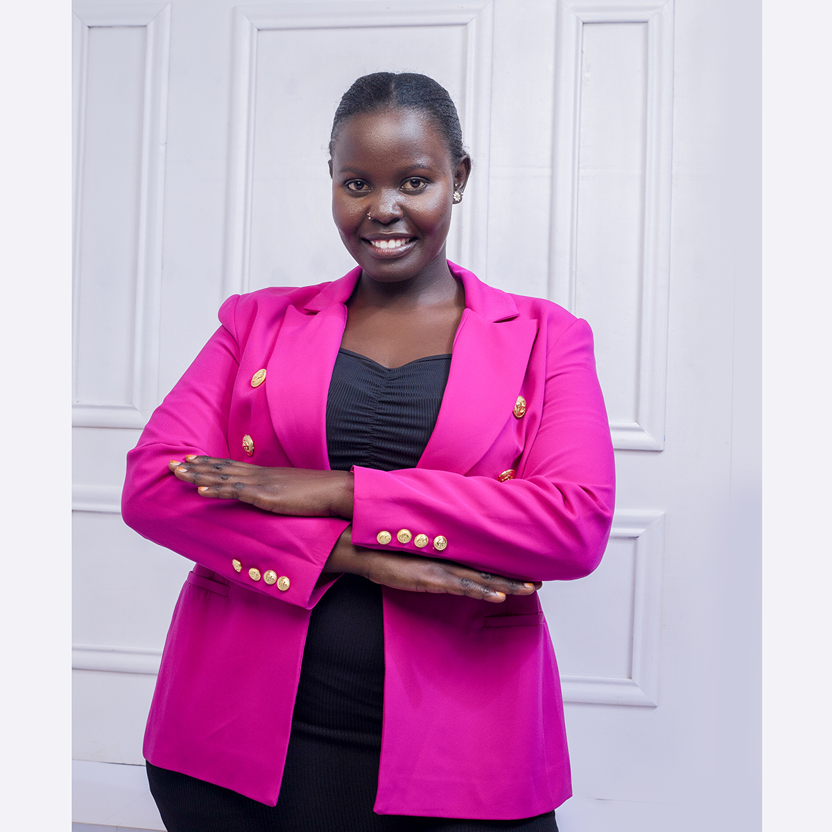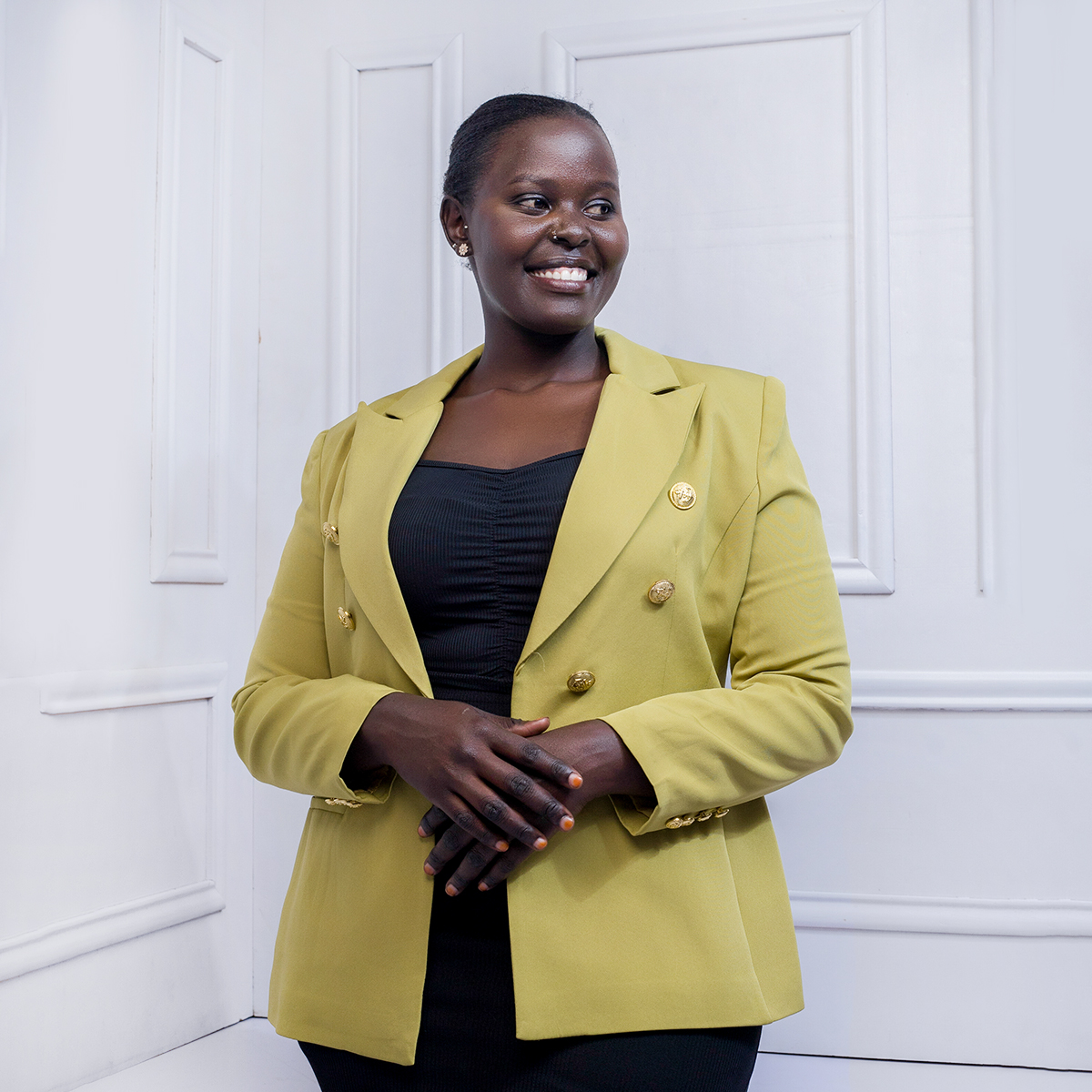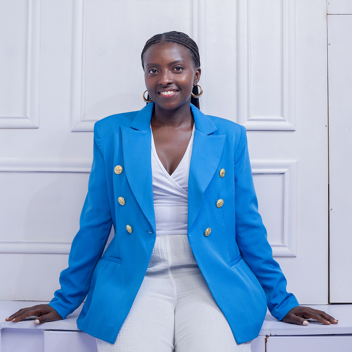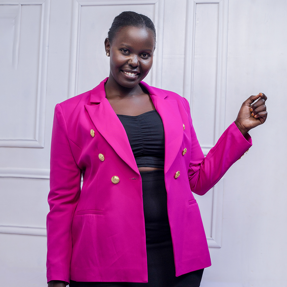 A tailored blazer accented with classic gold buttons, offering a polished silhouette, timeless elegance, and versatile styling for formal or smart-casual occasions.