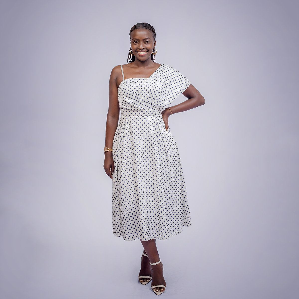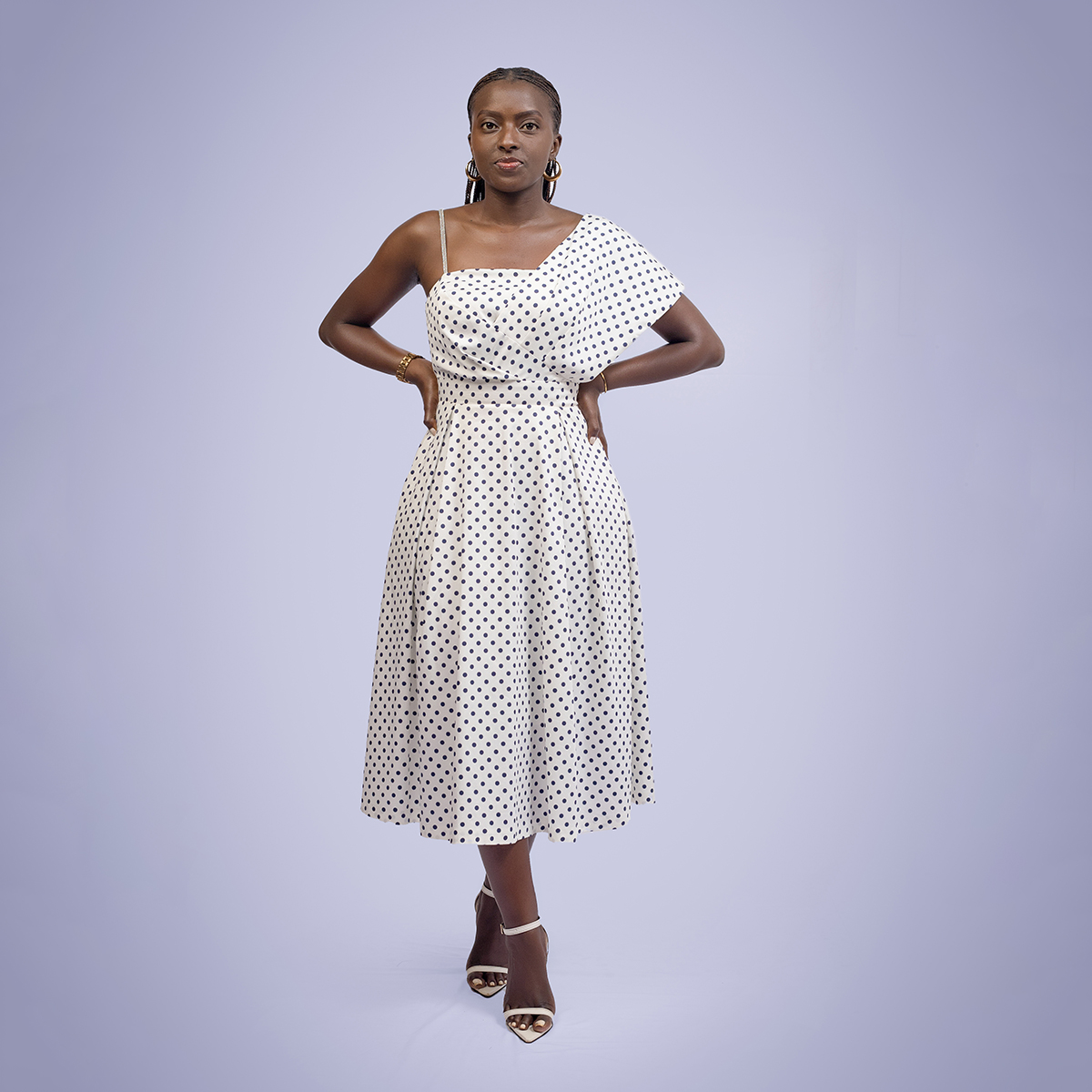 A one-arm dress adorned with classic polka dots, combining vintage-inspired charm, modern asymmetry, and effortless elegance for a standout yet timeless silhouette.
