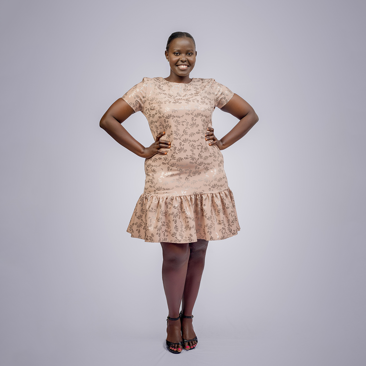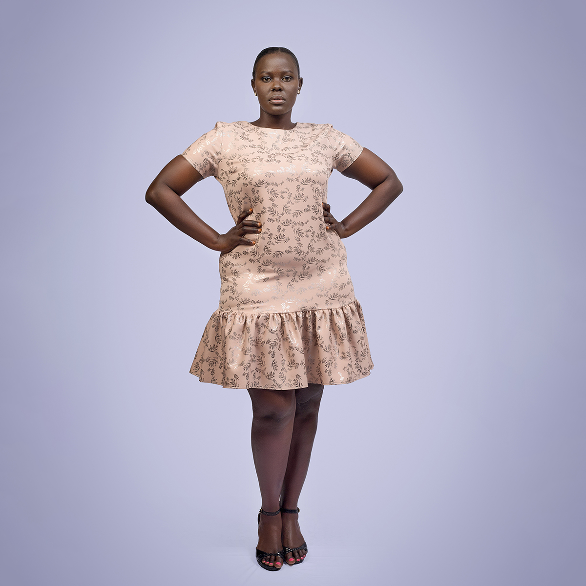 A classic shift dress accented with shiny leaf details, combining a clean silhouette, subtle sparkle, and timeless elegance for versatile, polished styling.