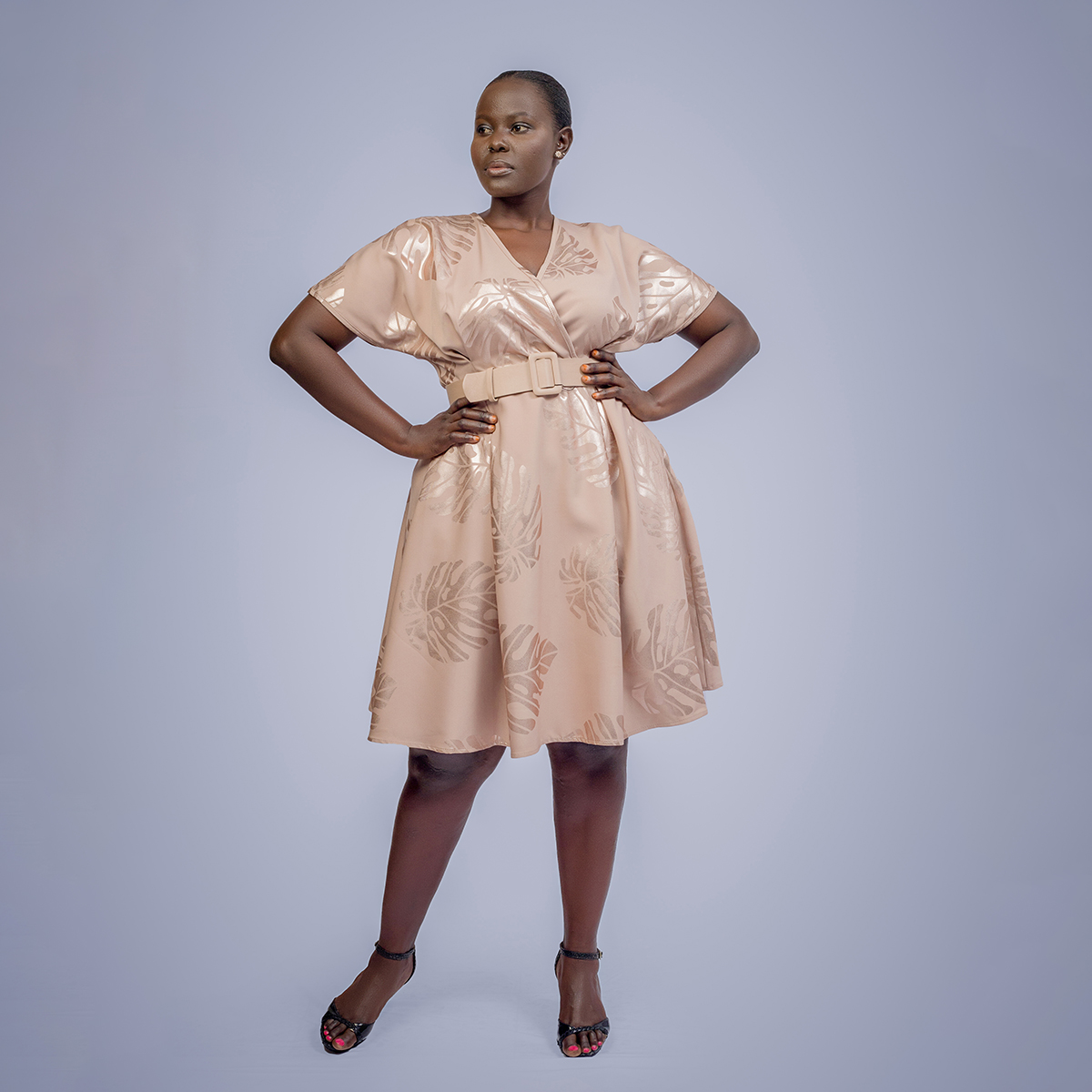A tropical-inspired design accented with shiny leaf details, blending natural motifs, subtle shine, and refined elegance for a bold yet polished look.